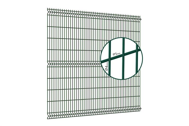 Diametro esterno del filo orizzontale mm Ø 5,00 , diametro esterno del filo verticale Ø 4,00 , maglia mm 50x200H (interno) e nervature orizzontali di rinforzo.